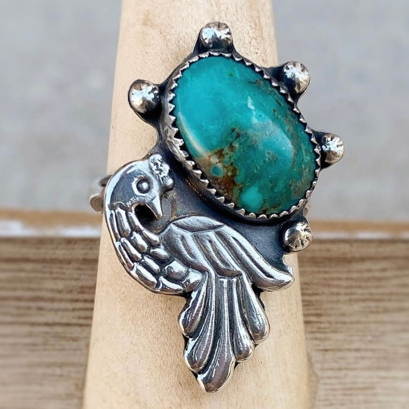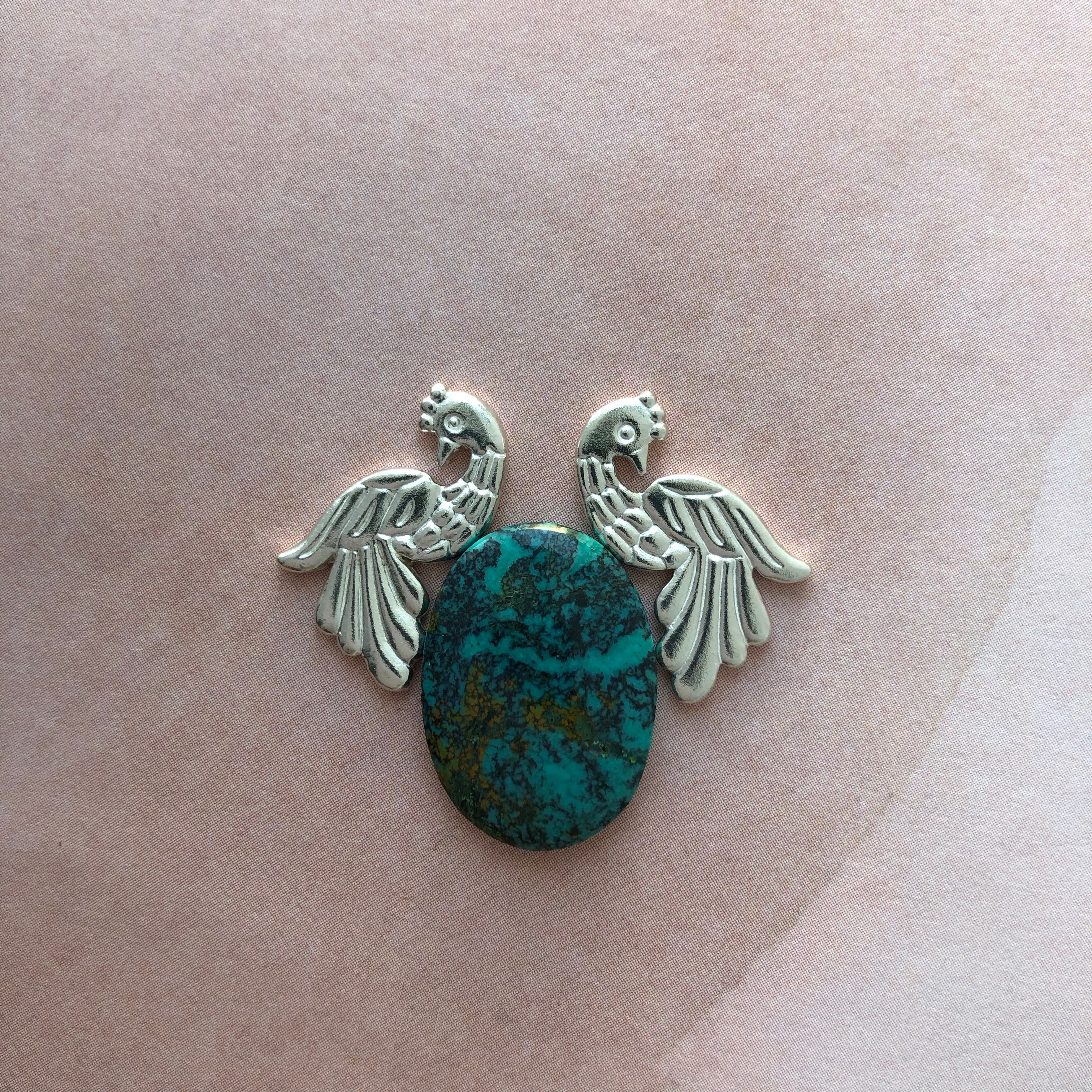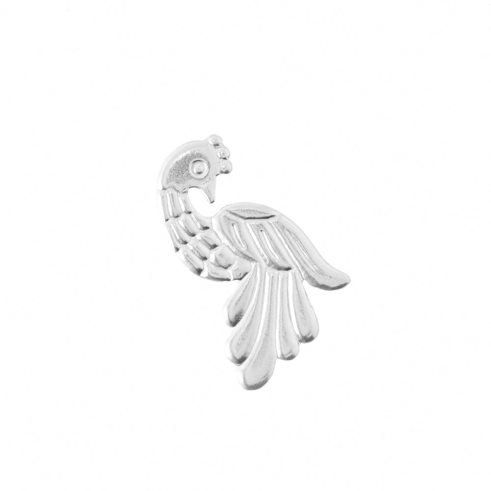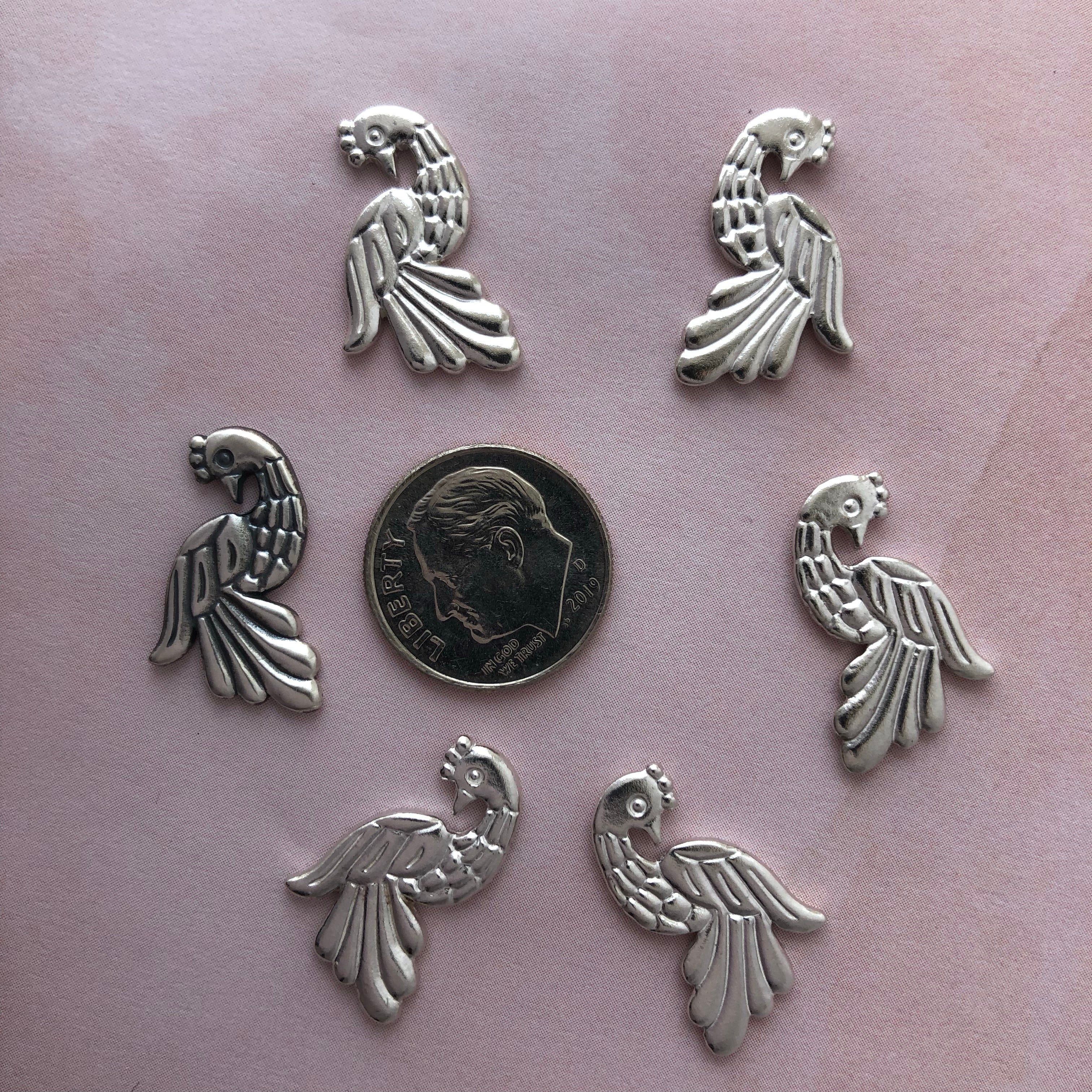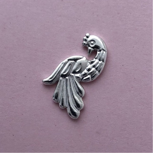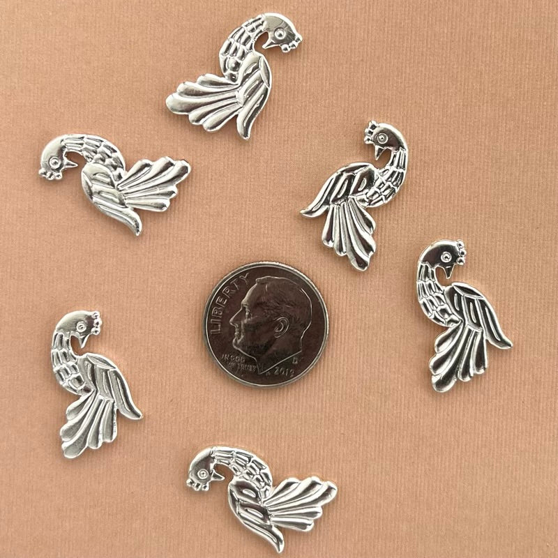 Bring a little elegance to your next jewelry piece with this silver otomi bird casting. Inspired by colorful Otomi embroidery that often features unique bird designs, this Mexican style silver peacock was carved on both sides, it would look lovely hugging up against your favorite stone as a cabochon border. This piece can be used solo as a charm by soldering a jump ring on it, or use it as a statement ring topper. We know you will find beautiful ways to incorporate this piece on your next cabochon ring or pendant! Price per each.