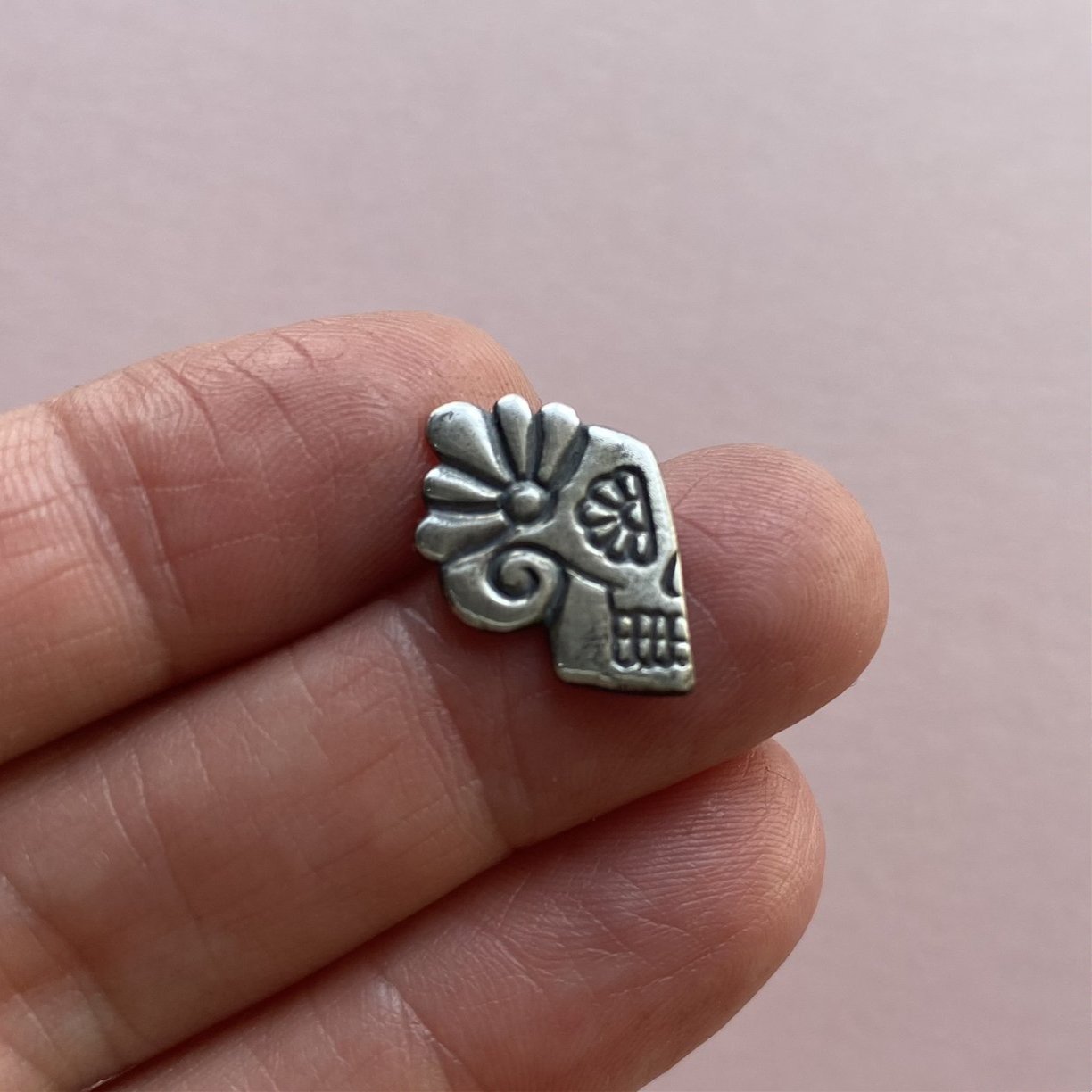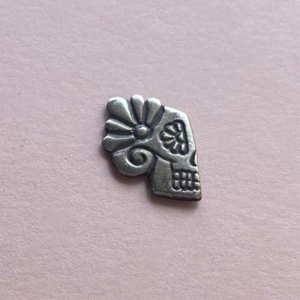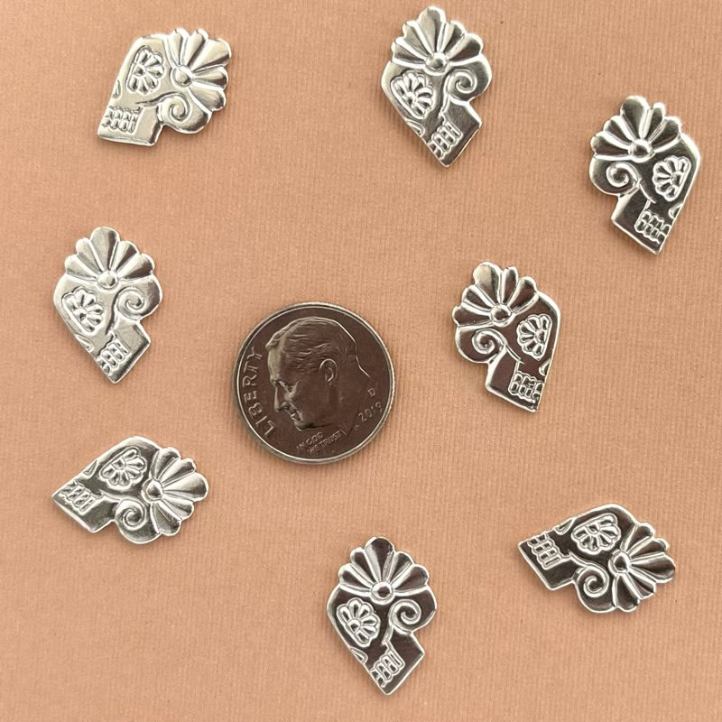 Bring a little "dia de los muertos" magic to your next jewelry piece with this sterling silver she skull. With beautiful details, this skull is sure to make a statement. This piece can be used as a charm by soldering a jump ring on it, or sweat solder to your base while soldering your next cabochon ring or pendant! Price per each.